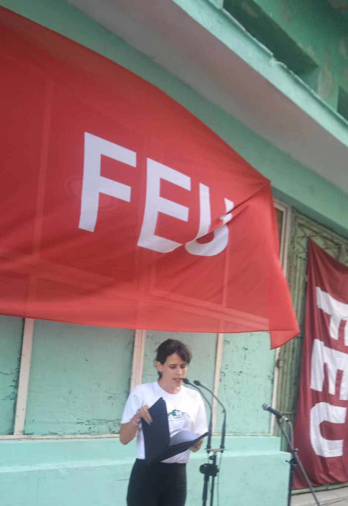 Liz Laura Elguezabal, integrante del Secretariado Nacional de la FEU, en las palabras centrales del tributo, reafirmó que la nueva generación de jóvenes siguen teniendo presente la impronta de aquellos que dieron su vida por la Revolución.