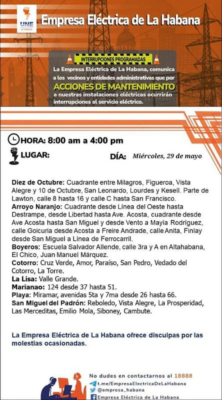 Afectaciones eléctricas para este miércoles 29 de mayo en La Habana