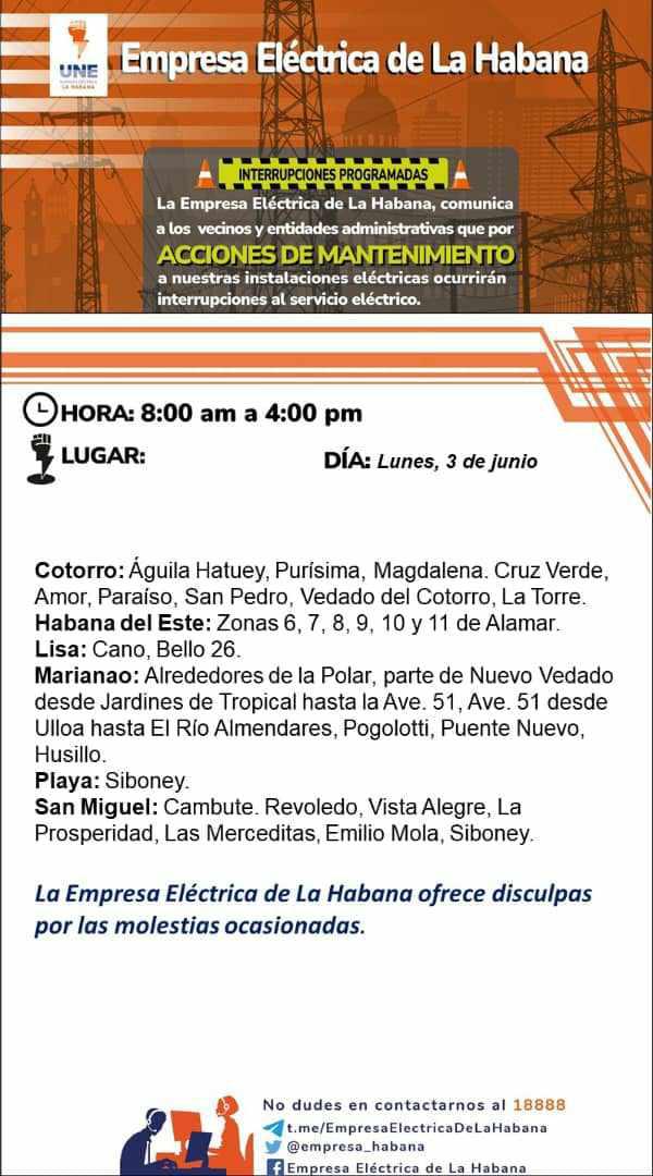 Afectaciones por déficit de generación eléctrica en La Habana, entre el 3 y el 8 de junio