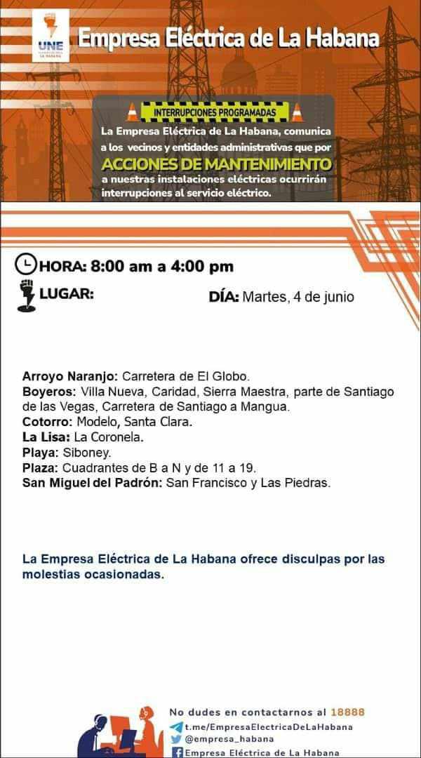Afectaciones por déficit de generación eléctrica en La Habana, entre el 3 y el 8 de junio