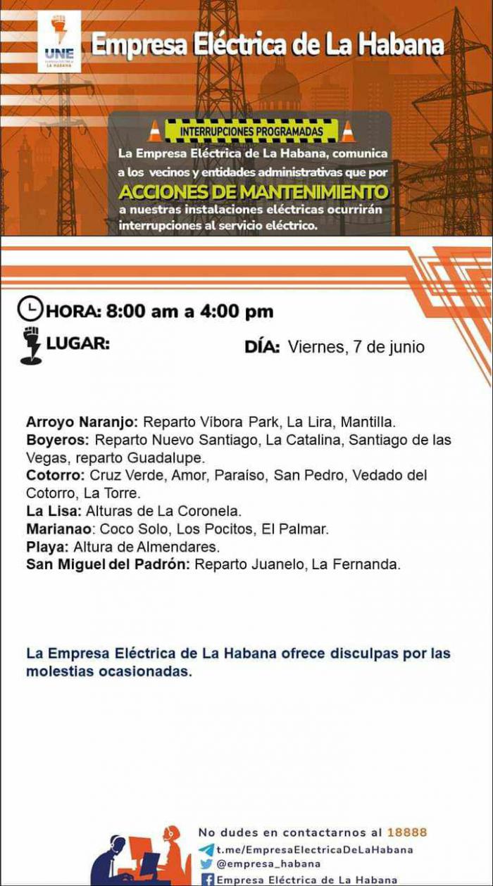 Afectaciones por déficit de generación eléctrica en La Habana, entre el 3 y el 8 de junio