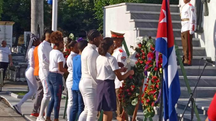 La peregrinación se dirigió al Panteón de las Fuerzas Armadas Revolucionarias, en la Necrópolis de Colón, donde depositaron ofrendas florales a nombre del General de Ejército, Raúl Castro Ruz, líder de la Revolución cubana; de Miguel Díaz-Canel Bermúdez, Primer Secretario del Comité Central del Partido Comunista de Cuba (CCPCC) y Presidente de la República; así como del Consejo de Estado y del pueblo cubano.