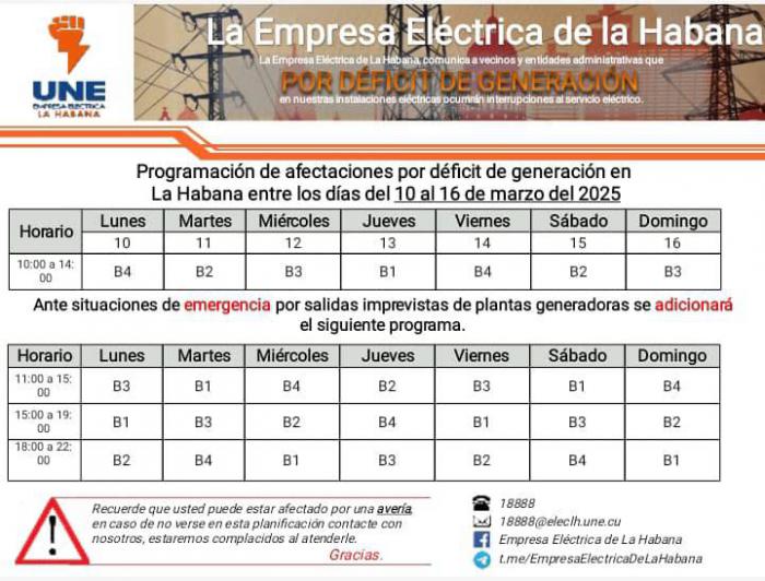 La Empresa Eléctrica de La Habana informa la programación de afectaciones eléctricas por déficit de generación para esta semana