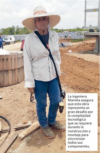 La ingeniera en comunicaciones Marieta García González, destaca entre la mayoría de quienes participan en la construcción del Parque Fotovoltaico de Boyeros. Su rostro bajo la sombra de un sombrero ancho me recuerda la imagen icónica de un filme cubano: Lucía. Pero ella, en su tiempo, en nuestro tiempo, precisa, orienta, verifica, controla y mantiene el ritmo de trabajo preciso como representante de las brigadas que ejecutan los sistemas de tierra (cableado) y conexión.