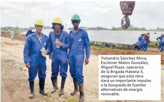Nada detiene el intenso laboreo de hombres y mujeres que construyen el nuevo parque fotovoltaico ubicado en el municipio de Boyeros, a medio kilómetro del santuario nacional de San Lázaro (El Rincón), en una llanura desbrozada con máquinas herramientas en la cual ya se alinean los paneles solares que serán conectados para garantizar una potencia de 21,87 mw, lo cual permite generar 35 000 mw, en cada año.