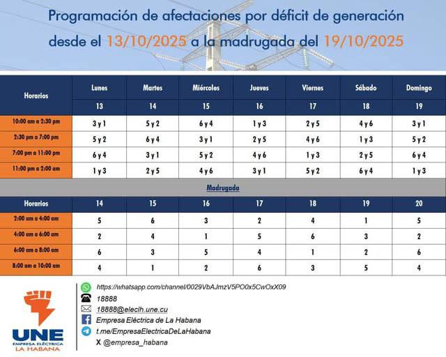 Programación de afectaciones por déficit de generación del 13 a la madrugada del 19 de octubre de 2025