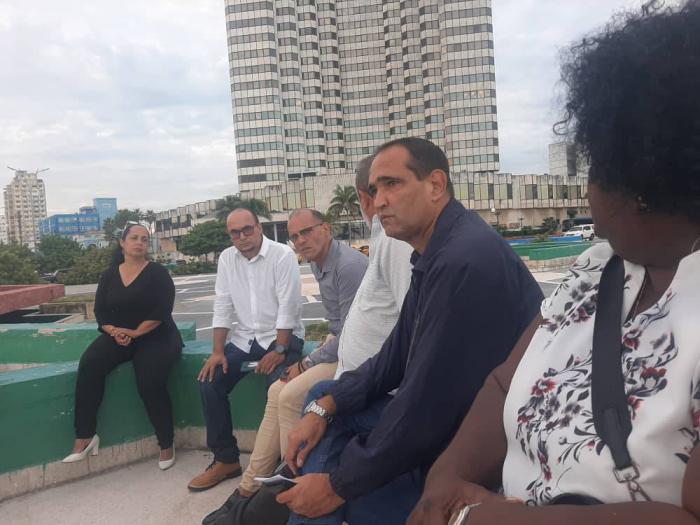 Con las las entidades encargadas del remozamiento a la Fuente de la Juventud, en Paseo y Malecón, el dirigente partidista sostuvo un intercambio.Foto: Cortesía Roilán Rodríguez Barbán