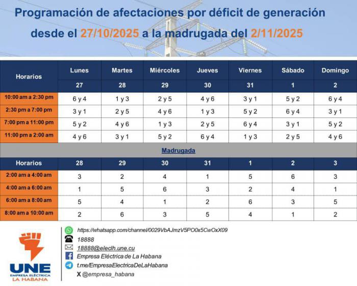 Programación de afectaciones por déficit de generación del 27 de octubre al 2 de noviembre de 2025.