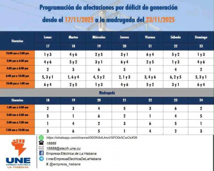 La Empresa Eléctrica de La Habana informa las afectaciones por déficit de generación hasta las 10:00 a.m. del 24 de noviembre