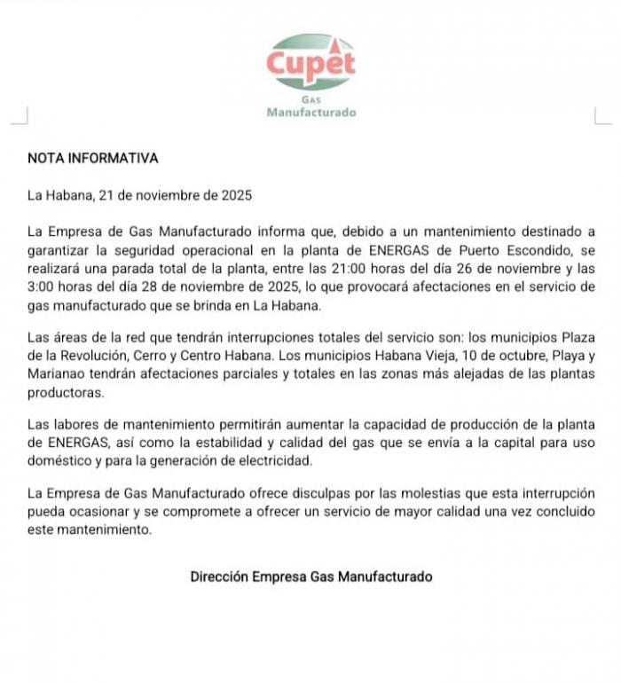 Debido a un mantenimiento para garantizar la seguridad operacional de la planta Energas, será necesario realizar una parada total a partir de las 21:00 horas del día 26 hasta las 3:00 horas del 28 de noviembre