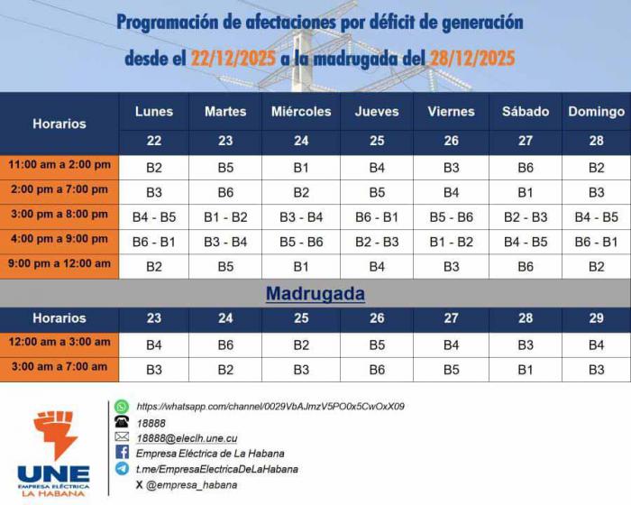 A través de sus perfiles institucionales en las redes sociales digitales, la Empresa Eléctrica de La Habana (EELH) informa a sus clientes la planificación de afectaciones por deficit de generación