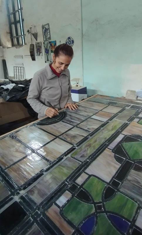 Trabajan junto a la profesora Mirell los graduados de más experiencia y alumnos de segundo año de vidriería, asumiendo las complejidades que entraña hacer un vitral: diseños, escalas, tamaño real y todo, antes de empezar a cortar los vidrios, para una vez montados, enmasillar, soldar por ambas caras y luego llevarlos a la lámpara de luz.