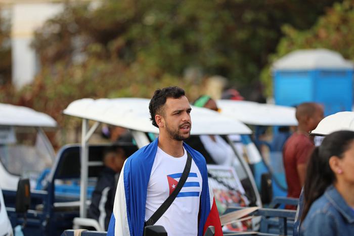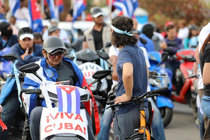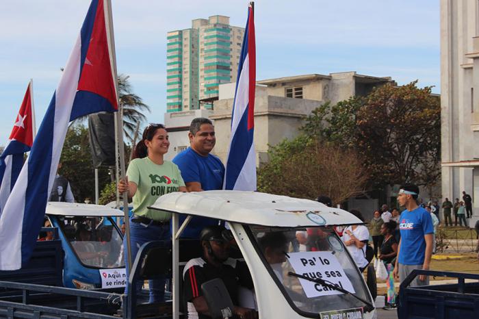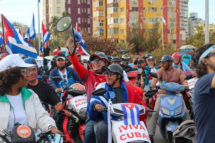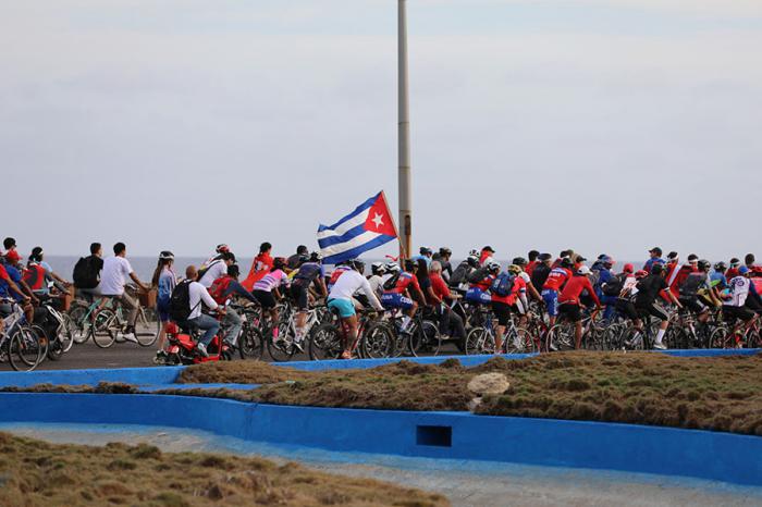 Jóvenes con carteles que denuncian el bloqueo, familias enteras sobre bicicletas. La parada se convierte en una fiesta combativa. Ríen, pero no olvidan. Pedalean con la convicción de que el cerco económico no es más fuerte que la voluntad de todo un pueblo.