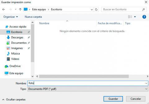 Después, clica en el botón Imprimir. Se abrirá la ventana Guardar impresión como, donde podrás nombrar el archivo y seleccionar la ubicación para guardarlo como PDF.