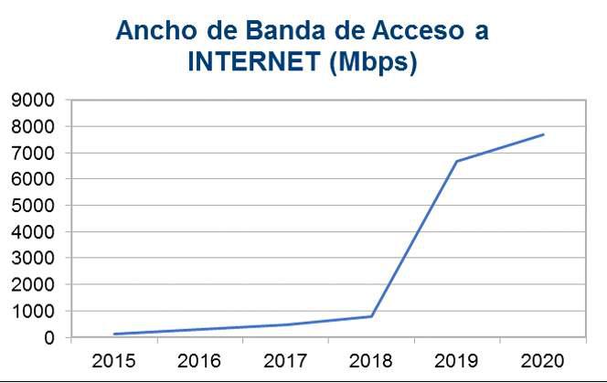 Durante el año 2019 y el transcurso de 2020 se ha consolidado una sinergia de trabajo entre la Empresa de Telecomunicaciones de Cuba (ETECSA) y el MES, lo que ha impactado de forma significativa en el desarrollo del proceso de informatización del organismo. Los principales avances se reflejan en materia de conectividad, ya que el ancho de banda tanto de acceso a INTERNET como a RedUniv ha tenido un incremento considerable en el presente año. En el caso de Internet, el ancho de banda total se ha incrementado hasta más de 7 Gbps en todo el sistema, se muestra en el gráfico a continuación.