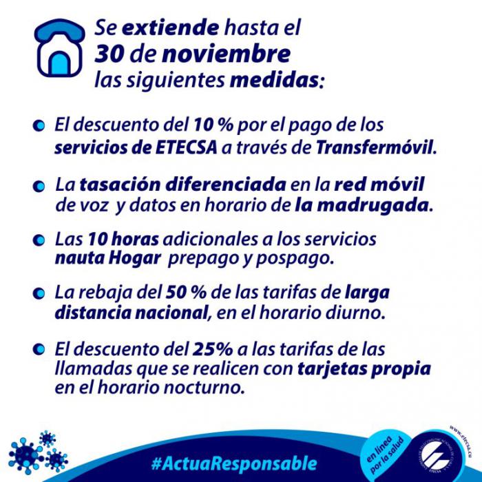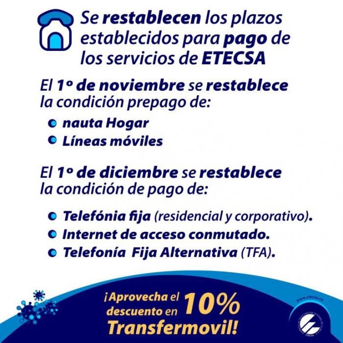 ETECSA anuncia el restablecimiento de los ciclos de vida útil de algunos servicios modificados a causa de la situación epidemiológica ocasionada por la COVID-19. Entre ellos está el pago de los servicios nauta Hogar, líneas móviles y telefonía básica, según su condición prepago o pospago.