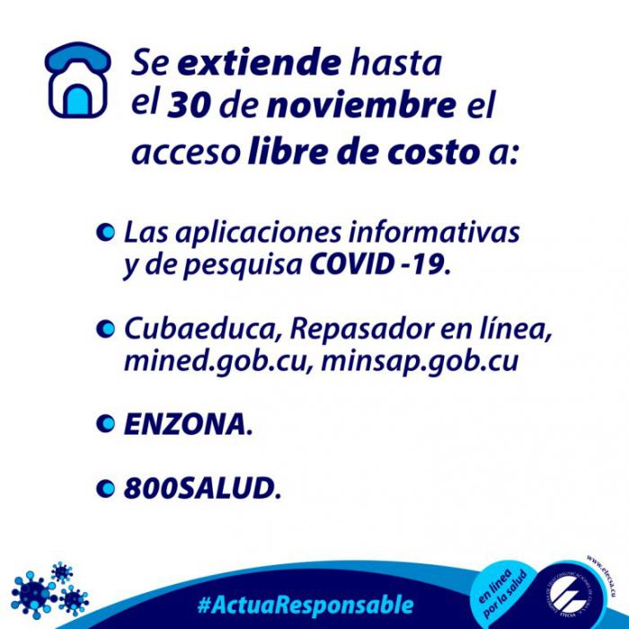 El acceso libre de costo a las aplicaciones informativas y de pesquisa COVID19, 800SALUD, Cubaeduca, repasador en línea, mined.gob.cu y ENZONA.
