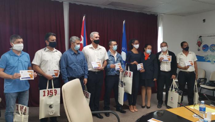 Perdomo, junto a Mayra Arevich, presidente ejecutiva de la Empresa de Telecomunicaciones de Cuba (ETECSA), entregó al colectivo de desarrolladores de esta plataforma para pagos digitales la certificación