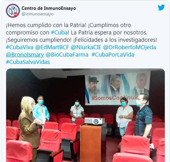 Por su parte, Niurka Margarita Carlos Pias, directora general del CIE, expresó también en la red social la satisfacción por este resultado. "Son muchos otros los compromisos y retos, nos falta mucho por hacer pero hoy estamos felices, cumplimos una tarea que debíamos a nuestro país. Felicidades a nuestros científicos que sin descanso trabajaron", escribió la directiva.
