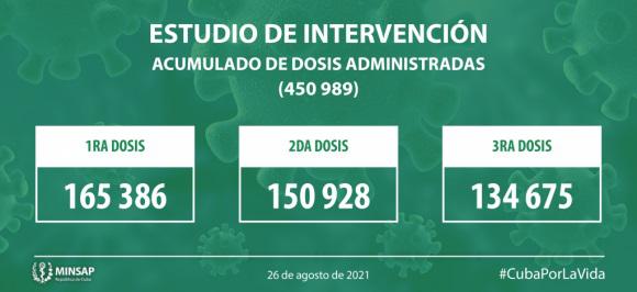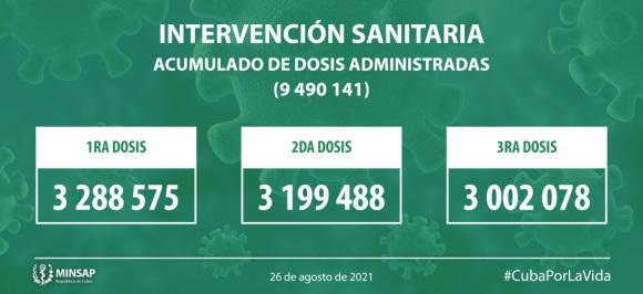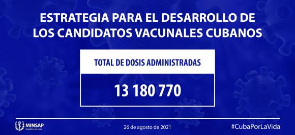 Hasta la fecha, 5 363 604 personas han recibido al menos una dosis de uno de los candidatos vacunales cubanos SOBERANA 02 y SOBERANA Plus, y de la vacuna cubana Abdala. De ellas ya tienen segunda dosis 4 528 607 personas y tercera dosis 3 288 559 personas.