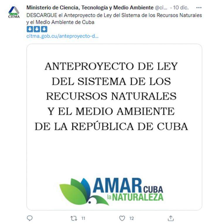 El Ministerio de Ciencia, Tecnología y Medio Ambiente de Cuba anunció en su cuenta oficial de Twitter la publicación, en el sitio web del CITMA, de una actualización del anteproyecto de Ley «Del Sistema de Recursos Naturales y el Medio Ambiente de la República de Cuba».