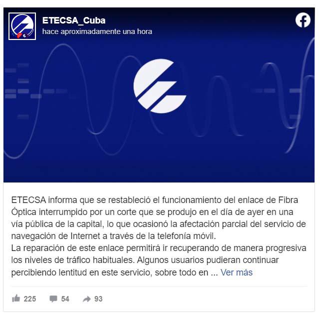 Así dio a conocer a través de Facebook la Empresa de Telecomunicaciones de Cuba (Etecsa) en un comunicado en el que recordó que lo ocurrido este martes impactó de manera parcial en el servicio de navegación de Internet a través de la telefonía móvil.