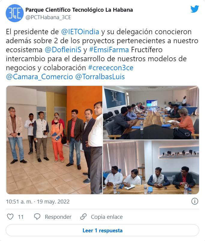 En su perfil en Twitter, el PCT publicó que el presidente de la IETO y la delegación que le acompaña conocieron además sobre dos de los proyectos pertenecientes al ecosistema de la entidad, DofleiniS y EmsiFarma.