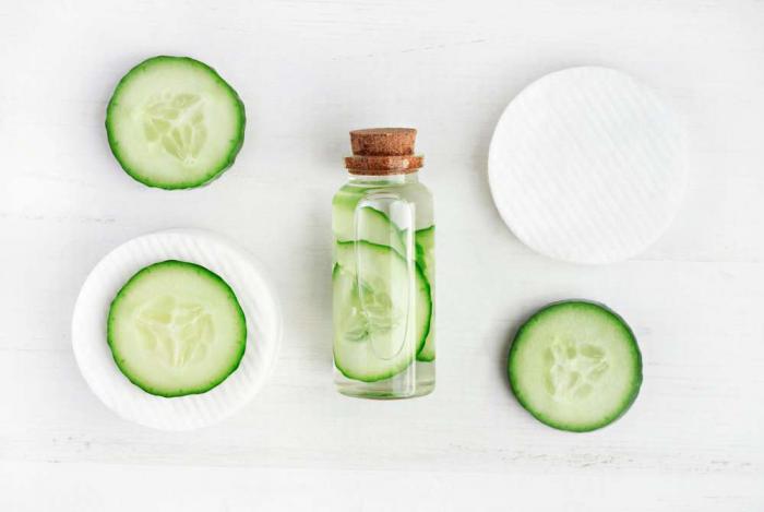Preparación: Lavar un pepino y cortarlo en pedazos pequeños. Luego, se introducen los pedazos de pepino en una cacerola con un litro de agua y se pone a hervir durante aproximadamente 30 minutos. Se deja enfriar el líquido resultante y se conserva en un frasco de vidrio con tapa para poder utilizarlo durante más tiempo. Aplicar solamente sobre la piel limpia con algodón.