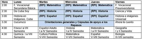Por su parte el Canal Tele Rebelde retransmitirá desde las 2:00 p.m. hasta las 5:00 p.m., los repasos para el ingreso a la Educación Superior, e incluye las materias dirigidas a la Educación de Jóvenes y Adultos.