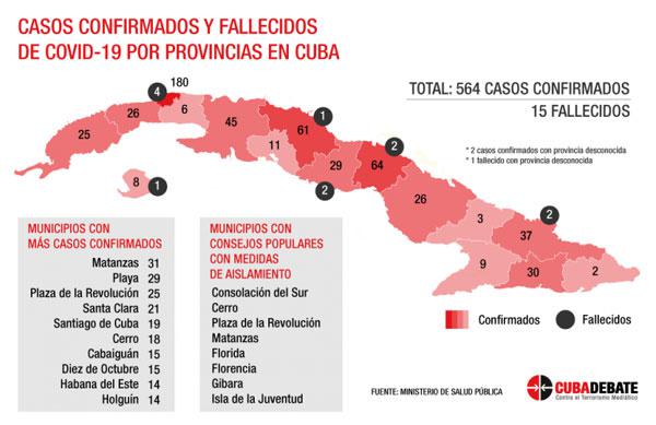 De los 527 cubanos confirmados, el 23% se infectaron en el exterior y el 76.7% (404) en el país: 392 de ellos fueron contactos de extranjeros y cubanos que regresaron del exterior, o de contactos de casos confirmados. Hay 12 casos en los que se sigue profundizando y buscando la fuente de infección.
