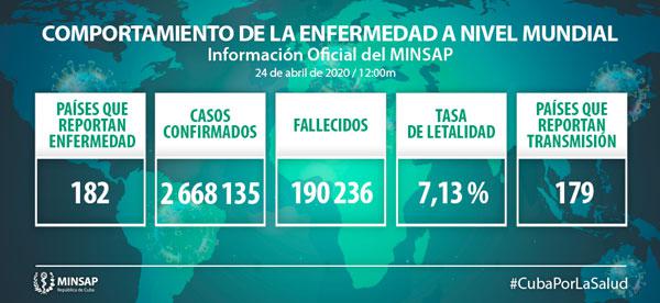 Hasta el 24 de abril se reportan 182 países con casos de COVID-19 con 2 millones 668 mil 135 casos confirmados (+ 80 mil 067) y 190 mil 236 fallecidos (+ 7 mil 428) para una letalidad de 7,13% (+0,07).
