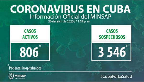 Al cierre del día de ayer, 26 de abril, se encuentran ingresados en hospitales para vigilancia clínico epidemiológica 3 mil 546 pacientes. Otras 5 mil 556 personas se vigilan en sus hogares, desde la Atención Primaria de Salud.