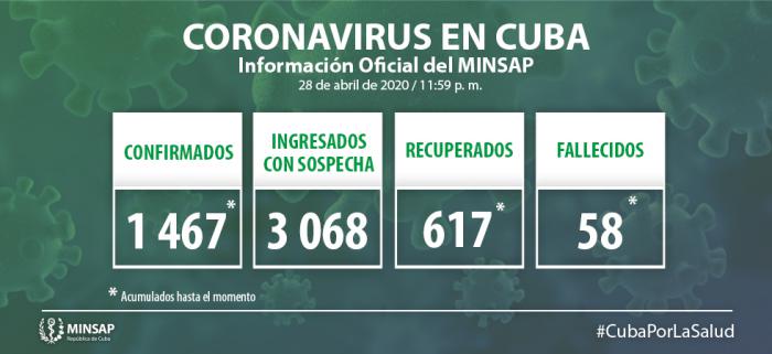 Al cierre del día de ayer, 28 de abril, se encuentran ingresados en hospitales para vigilancia clínico epidemiológica 3 mil 68 pacientes. Otras 6 mil 839 personas se vigilan en sus hogares, desde la Atención Primaria de Salud.