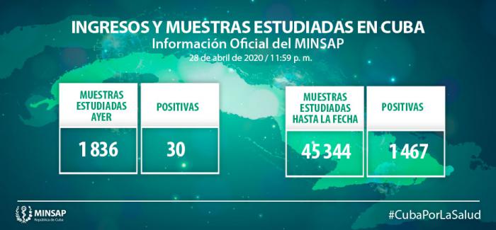 Para COVID-19 se estudiaron mil 836 muestras, resultando 30 muestras positivas. El país acumula 45 mil 344 muestras realizadas y mil 467 positivas (3.2%). Por tanto, al cierre del día de ayer se confirman 30 nuevos casos, para un acumulado de mil 467 en el país.