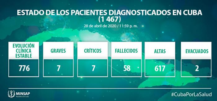 De los mil 467 pacientes diagnosticados con la enfermedad, 790 se mantienen como casos activos, y de ellos, 776 presentan evolución clínica estable. Se reportan 58 fallecidos (no se reporta nuevos fallecidos en el día de ayer), dos evacuados y 617 altas (42 más en el día de ayer). Se reportan siete pacientes en estado crítico y siete pacientes en estado grave.