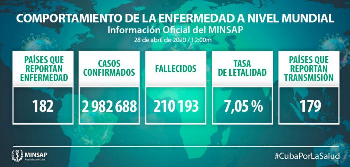 Hasta el 28 de abril se reportan 183 países con casos de COVID-19 con 2 millones 982 mil 688 casos confirmados (+66 mil 350) y 210 mil 193fallecidos (+ 4 mil 270) para una letalidad de 7,05% (-0,01).