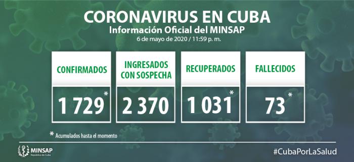 Al cierre del día de ayer, 6 de mayo, se encuentran ingresados en hospitales para vigilancia clínico epidemiológica 2 mil 370 pacientes. Otras 6 mil 362 personas se vigilan en sus hogares, desde la Atención Primaria de Salud.