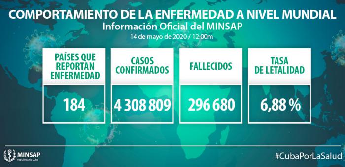 Hasta el 14 de mayo se reportan 184 países con casos de COVID-19, 4 millones 308 mil 809 casos confirmados (+ 85 mil 762) y 296 mil 680 fallecidos (+ 5 mil 161) con una letalidad de 6,88 % (-0,02).