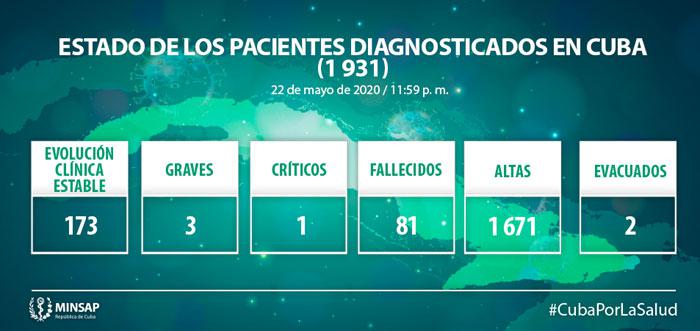 - Ciudadana cubana de 55 años, residente en el municipio Boyeros, provincia La Habana. Contacto de caso confirmado anteriormente. Se mantienen en vigilancia 13 contactos.