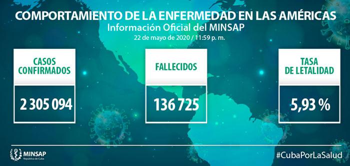 En la región de las Américas se reportan 2 millones 305 mil 094 casos confirmados (+ 59 mil 870), el 45,49% del total de casos reportados en el mundo, con 136 mil 725 fallecidos (+ 3 mil 284) y una letalidad de 5,93% (-0,01).