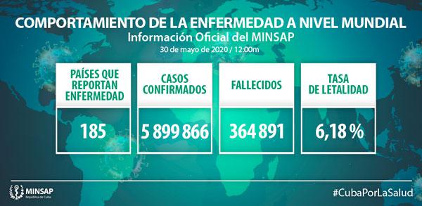Hasta el 30 de mayo se reportan 185 países con casos de COVID-19, con 5 millones 899 mil 866 casos confirmados (+ 122 mil 932) y 364 mil 891 fallecidos (+ 4 mil 802) con una letalidad de 6,18% (-0,05).
