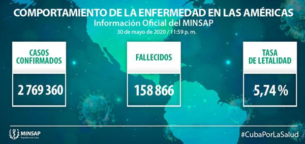 En la región de las Américas se reportan 2 millones 769 mil 360 casos confirmados (+ 70 mil 841), el 46,94% del total de casos reportados en el mundo, con 158 mil 866 fallecidos (+ 3 mil 102) y una letalidad de 5,74% (-0,03).