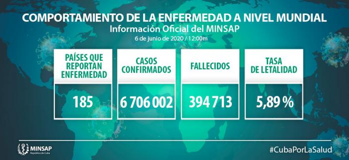 Hasta el 6 de junio se reportan 185 países con casos de COVID-19 con 6 millones 706 mil 002 casos confirmados (+ 102 mil 673) y 394 mil 713 fallecidos (+ 2 mil 981) con una letalidad de 5,89% (-0,04).