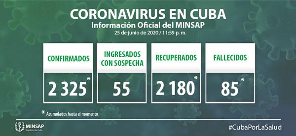 - Ciudadano cubano de 61 años de edad, residente en el municipio San José de las Lajas, provincia Mayabeque. Se investiga la fuente de infección. Se mantienen en vigilancia 32 contactos.