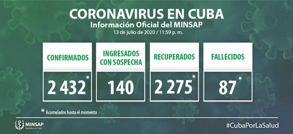 De los 2 mil 432 pacientes diagnosticados con la enfermedad, se mantienen ingresados confirmados 68 (2,8%), de ellos 67, el 98,5%, con evolución clínica estable. Se reportan 87 fallecidos (ninguno del día), dos evacuados y 2 mil 275 pacientes recuperados (94%) (7 en el día de ayer). No se reportan pacientes en estado crítico y 1 en estado grave.
