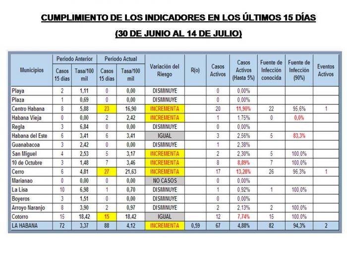 Al cierre del día la provincia presenta una tasa de incidencia acumulada de 64,2 por 100 000 habitantes, siete municipios por encima de la media provincial: Cotorro, Centro Habana, Cerro, Regla, La Habana del Este, La Lisa y La Habana Vieja.