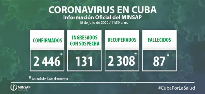 De los 2 446 pacientes diagnosticados con la enfermedad, se mantienen ingresados confirmados 49 (2,0 %), de ellos el 100 % con evolución clínica estable. Se reportan 87 fallecidos (ninguno del día), dos evacuados, cuatro altas del día, se acumulan 2 308 pacientes recuperados (94,4 %). No se reportan pacientes en estado crítico, ni en estado grave.
