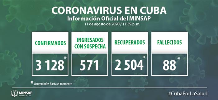 De los 3 mil 128 pacientes diagnosticados con la enfermedad, se mantienen ingresados confirmados 534 (17,1%), 528 el 98,9% con evolución clínica estable. Se reportan 88 fallecidos (ninguno del día), dos evacuados, 32 altas del día, se acumulan 2 mil 504 pacientes recuperados (80 %). Se reportan 2 pacientes en estado crítico y cuatro en estado grave.