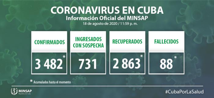 De los 3 mil 482 pacientes diagnosticados con la enfermedad, se mantienen ingresados confirmados 529 (15,2%), 518 el 98% con evolución clínica estable. Se reportan 88 fallecidos (ninguno del día), dos evacuados y se acumulan 2 mil 863 pacientes recuperados (82,3%) (69 altas del día). Se reportan cuatro pacientes en estado crítico y siete en estado grave.