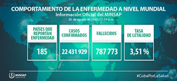 Hasta el 20 de agosto se reportan 185 países con casos de COVID-19, asciende a 22 millones 431 mil 929 los casos confirmados (+ 280 mil 648) y 787 mil 773 fallecidos (+ 6 mil 650) para una letalidad de 3,51% (-0,01).